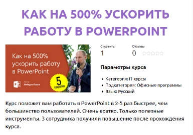 3 сотрудника получили повышение после прохождения курса. 12% получают благодарность от руководства. 5 коротких уроков, с практическими инструментами, чтобы создавать презентации быстрее, чем вы делаете обычно. Подойдет как для начинающих пользователей, так и для опытных. Научитесь создавать презентации PowerPoint быстрее ваших друзей и коллег.